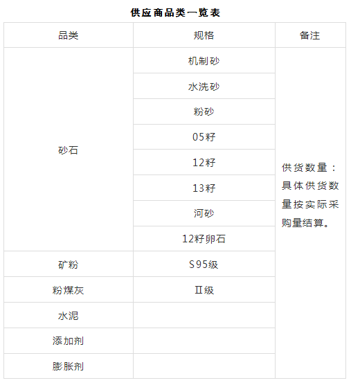 本次征集活動(dòng)為2025年度第一次原材料供應(yīng)商的征集,征集供應(yīng)商品類為:砂石、水泥、粉煤灰、礦粉、膨脹劑、減水劑、外加劑等,現(xiàn)每年總需求約200萬噸。